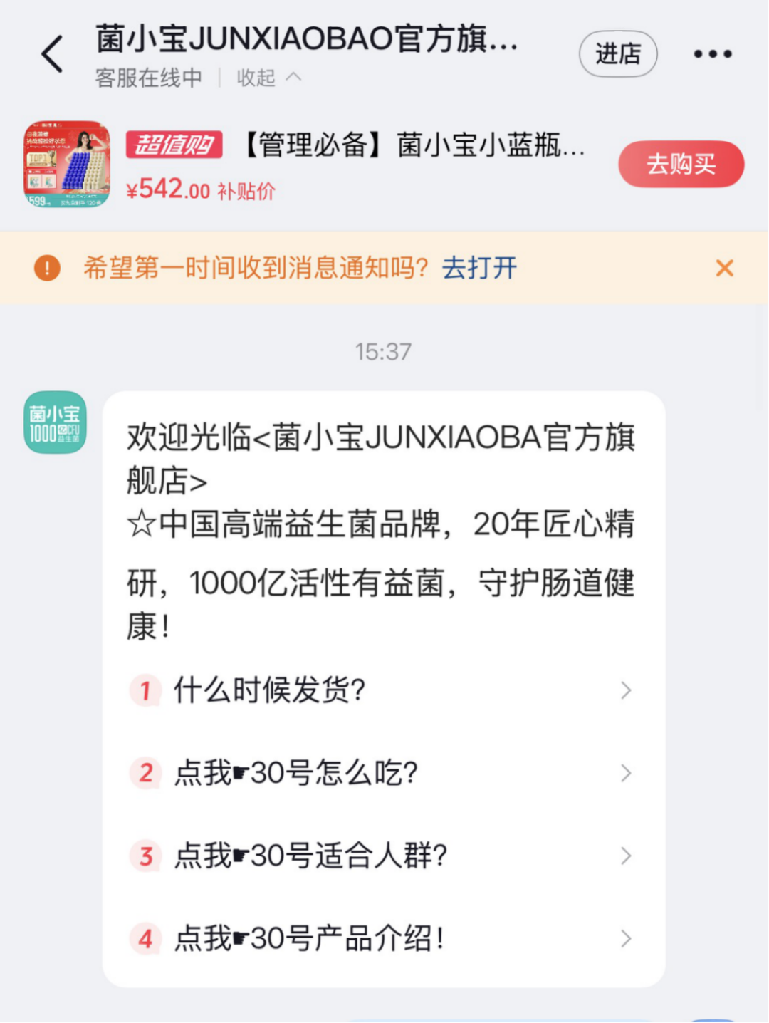 但耐人寻味的是,在菌小宝抖音官方旗舰店的客服对话页,自动弹出的常见问题里,仍包含“30号怎么吃”“适合人群”“产品介绍”等相关条目。