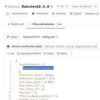 在知名的 AI 开源库 Hugging Face 上,Rukuten AI 3.0 赫然在自己的配置文件里面写着架构来自 DeepSeek V3。